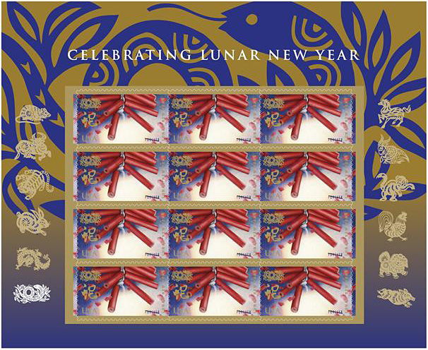 Lunar New Year: Year of the Snake [Click to see sheet] The USPS will welcome the New Year with a bang—in the form of a bundle of firecrackers—colored red for good fortune—on its 2013 Lunar New Year (Year of the Snake) stamp. The Chinese character for "Snake," drawn in grass-style calligraphy, is seen on the left side of the stamp, which is being issued as a Forever ® stamp in self-adhesive sheets of 12. The Year of the Snake begins on February 10, 2013, and ends on January 30, 2014. People born during the Year of the Snake are said to be deeply philosophical, mysterious, and comfortable being alone. The Lunar New Year is celebrated in various ways, inluding the use of firecrackers to scare off evil spirits and welcome a time of renewed hope. |