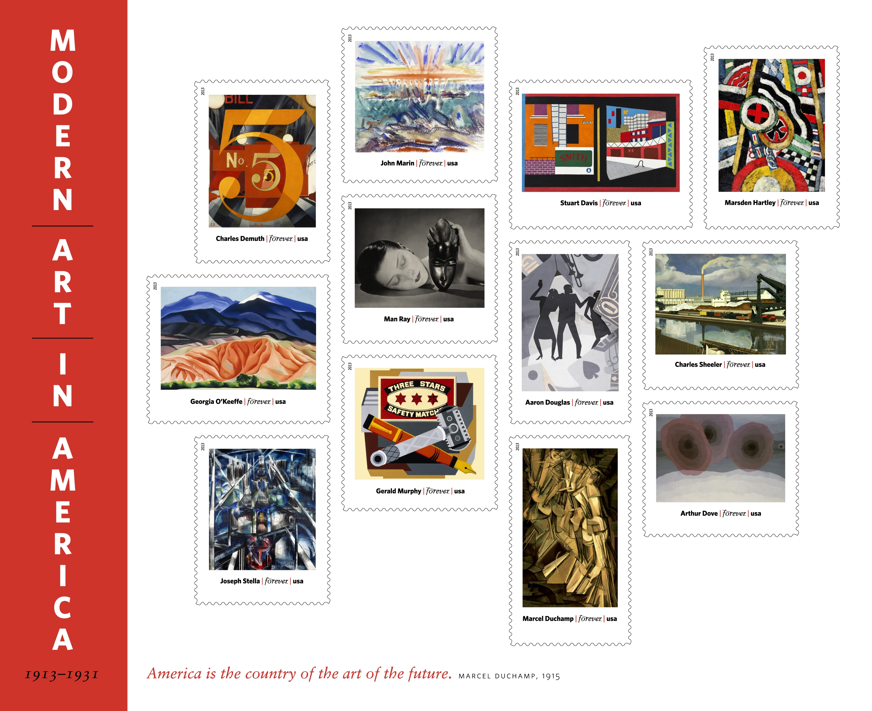 Modern Art in America, 1913 - 1931 [Click to see sheet] The U.S. Postal Service commemorates 12 important modern artists and their works 100 years after the groundbreaking Armory Show opened in New York in 1913. The masterpieces, all created between 1912 and 1931, are Stuart Davis's House and Street; Charles Demuth'sISaw the Figure 5 in Gold; Aaron Douglas' The Prodigal Son, Arthur Dove's Fog Horns, Marcel Duchamp's Nude Descending a Staircase, No. 2—shown here, the most talked-about work at the Armory Show of 1913—Marsden Hartley's Painting, Number 5, John Marin's Sunset, Maine Coast, Gerald Murphy's Razor, Georgia O'Keeffe's Black Mesa Landscape, New Mexico / Out Back of Marie's II, Man Ray's Noire et Blanche, Charles Sheeler's American Landscape, and Joseph Stella's Brooklyn Bridge. |