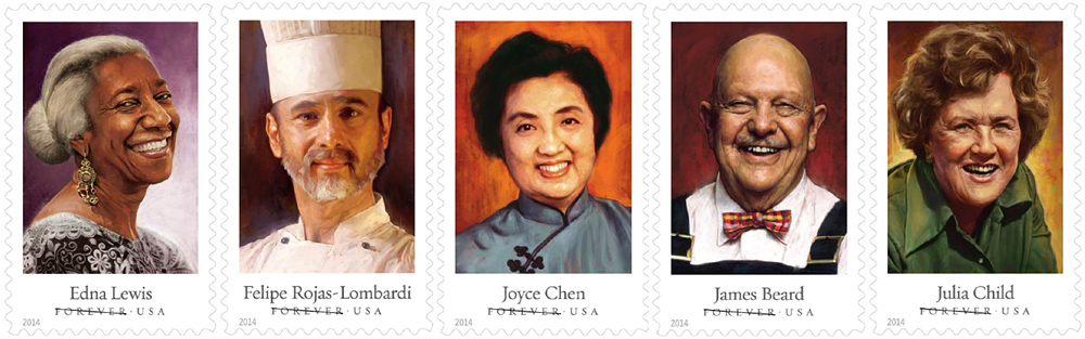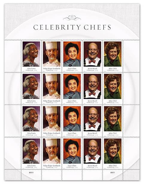 Celebrity Chefs The Celebrity Chef set will feature James Beard, a leader in modern cooking trends; Julia Child, the iconic host of Public Television's "The French Chef"; Joyce Chen, who popularized Chinese cooking on TV; Edna Lewis, an African-American chef of the 1930s; and Felipe Rojas-Lombardi, a Peruvian chef in the 1970s New York restaurant scene. The stamps will be issued at Chicago's Park Grill during a gourmet food show. |