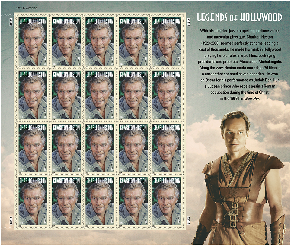 Legends of Hollywood: Charlton Heston (Forever) [Click to see sheet] The 18th stamp in the Legends of Hollywood series salutes an actor who was known for tackling heroic roles in epic blockbusters. Heston made more than 70 films in a career that spanned seven decades. An image of Heston from the 1959 movie Ben-Hur decorates the selvage. The hand-tinted photo shows Heston, who won a best actor Oscar, in his costume from the monumental chariot racing scene, one of the most famous action sequences ever filmed. In other famous roles, Director Cecil B. DeMille tapped Heston for the role of Moses in The Ten Commandments, the 1956 movie that tells the story of Exodus with a cast of thousands, spectacular special effects, and a Charlton Heston who could convincingly raise a rod over his head and part the Red Sea. And in 1968's Planet of the Apes he was a time- traveling astronaut trapped on a planet ruled by English-speaking apes. |