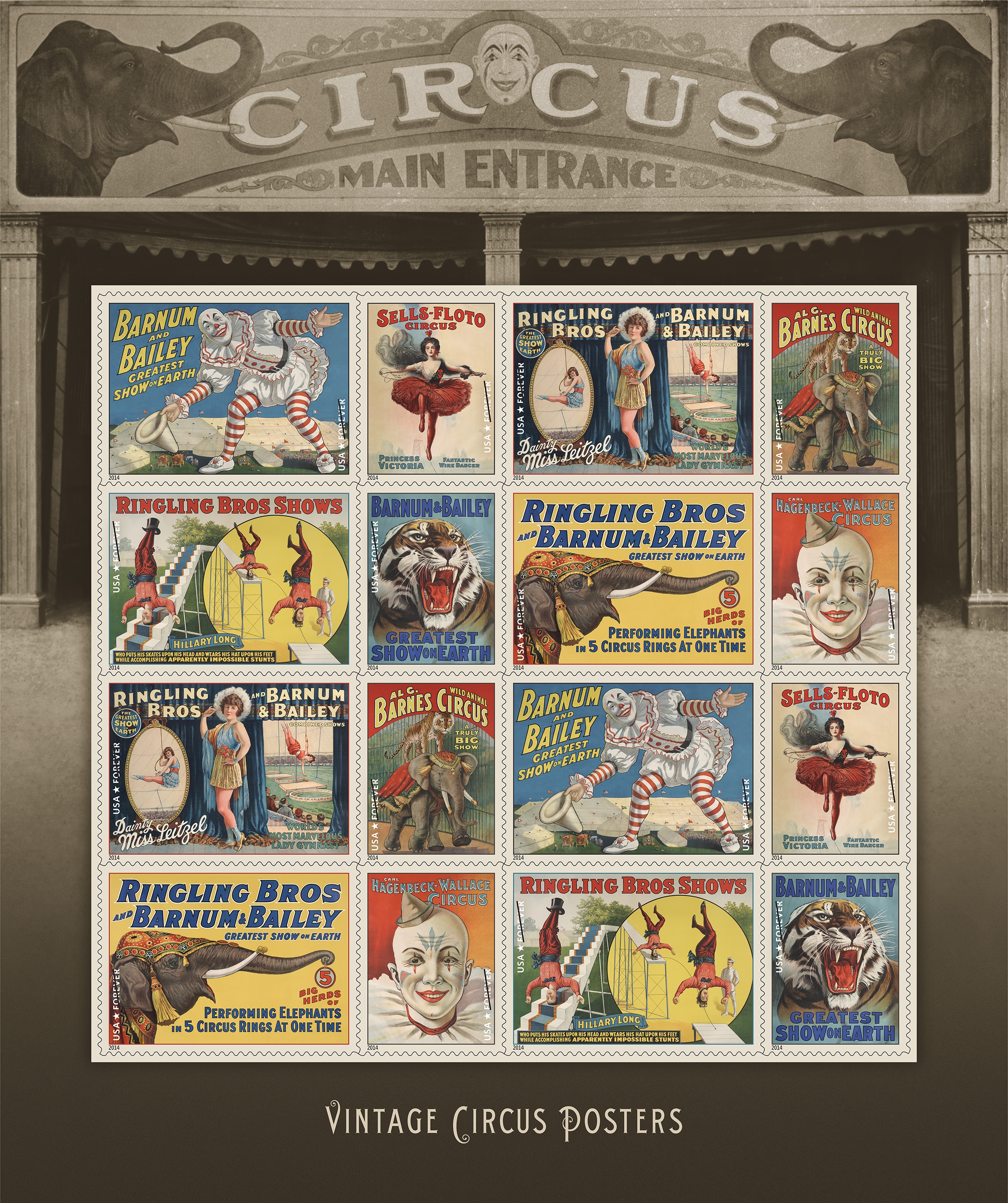 Circus: Vintage Posters (Forever) [Click to see sheet of 8 designs] Since the early 20th century, the circus has brought together people of all ages and walks of life to watch the amazing acts and let their imaginations soar. Back in the day, companies like the Ringling Bros. and Barnum & Bailey would use posters with eye-catching imagery of stunts, performers, and animals as a vehicle to attract people to come watch the circus. With these stamps the U.S. Postal Service pays tribute to the history of these vintage works of art. The eight stamps were inspired by original circus posters that are now part of the Tibbals Digital Collection at The Ringling Museum in Sarasota, Florida. Here are some other recent Nostalgic/Vintage issues in which you might be interested: |