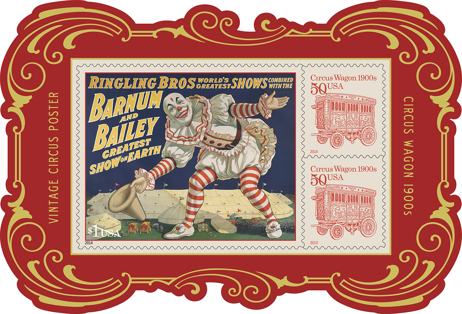 Circus Souvenir Sheet In a controversial "first" the U.S. Postal Service decided to sell a unique issue available as a single sheet in mint condition only within its 2014 Yearbook, or in an uncut Press Sheet of 12 souvenir sheets. The Circus souvenir sheet features the design of the Barnum & Bailey Clown forever stamp from the May 5 Circus issue, but with a $1 denomination, and a pair of the 1900s Circus Wagon stamps first issued as 5¢ stamps in 1990, but as 50¢ stamps on the souvenir sheet. As an option to the mint sheet in the Year Book or Press Sheet, collectors can obtain First Day Covers with the souvenir sheet already affixed and cancelled on December 10. The USPS sells uncacheted Circus SS FDCs for $4.50 each. Another option is to purchase a serviced FDC cover from cachet makers, including SNN advertiser Artcraft, at https://www.washpress.com/ |