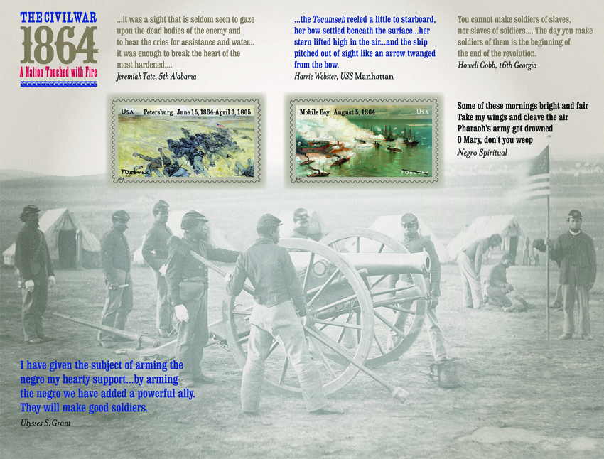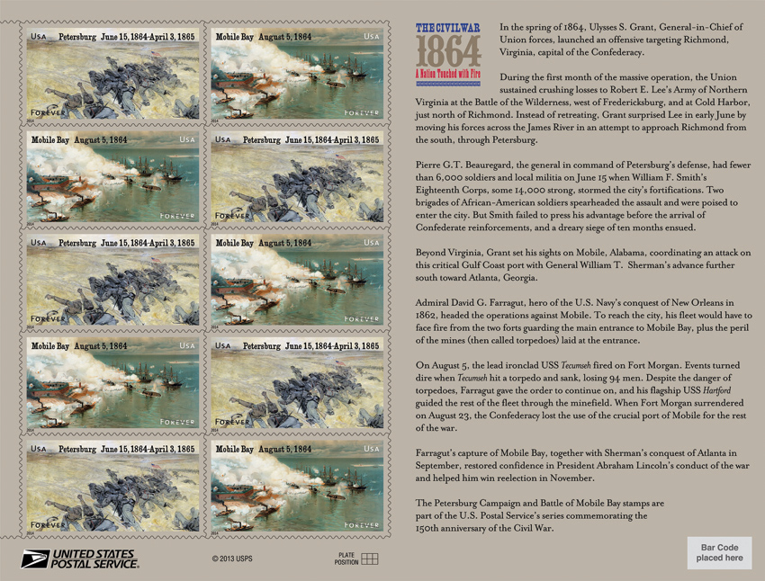 Civil War: 1864 (Forever) This series continues, with stamps in an illustrated sheet observing the Siege of Petersburg, Va., and the Battle of Mobile Bay, where Admiral Farragut damned the torpedoes and ordered "Full Speed Ahead." The front of the souvenir sheet contains two stamps along with a photograph of Battery A, 2nd U.S. Colored Artillery (Light) and quotes including one from General Ulysses S. Grant. The back contains five of each stamp and background information on the two battles. |