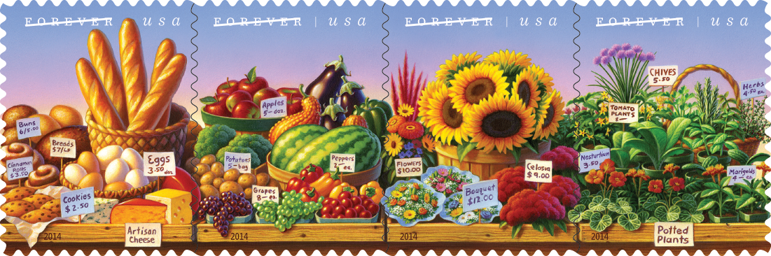 Farmer's Markets (Forever) A throwback to the past, before the advent of packaged goods, supermarket chains and importing of produce from around the word, farmers markets support small farms, boost local economies and offer shoppers the opportunity to interact directly with the people who produce their food. In addition they bring together shoppers with vendors where they socialize, catch up on community news, and exchange ideas and opinions. The four se-tenant stamps depict a table laden with typical farmers-market fare. The artist chose and arranged the products so that each stamp has a large focal point and each stamp is complete in itself, yet forms a cohesive whole with the entire stamp strip. Most items bear handwritten labels that identify the product and its price. |