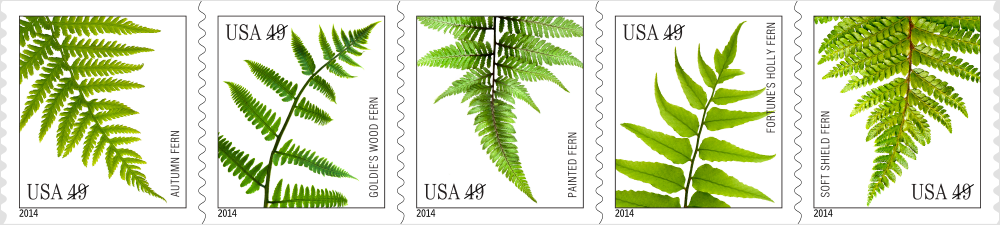 Ferns (Forever 49¢) Denominated First Class Rate This is a new printing of the January 27, 2014 issue. The ferns featured on these stamps are five of the approximately 380 different species found in North America. A favorite with gardeners and florists, ferns range from tiny moss-like plants to giants as tall as trees. The shapes and textures of the fronds stand out against a white background, highlighting the placement of the leaflets along each fern's stem. The name of each fern is placed vertically in capital letters along one edge of the stamp. The ferns continue the USPS tradition of offering stamps that feature beautiful plants. Designed to be used by businesses, they are being issued in large self-adhesive coils. |