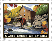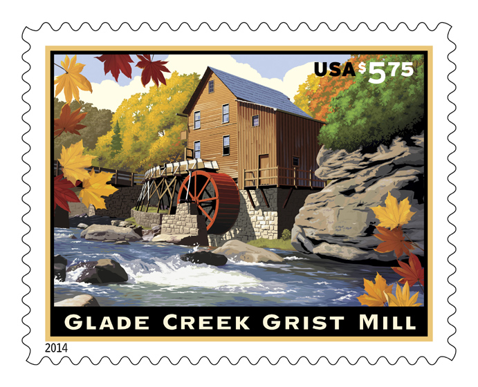 Glade Creek Grist Mill (Priority Mail) The USPS is anticipating an increase in the basic Priority Mail rate to $5.75, with the release of a stamp that pictures West Virginia's Glade Creek Grist Mill. The pictured mill is actually a 1976 replica of an old mill that once stood nearby, made of parts of three other historic old mills. Illustrator Dan Cosgrove pictured the mill in an autumn setting in Babcock State Park. |