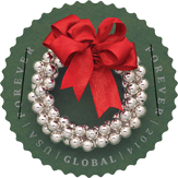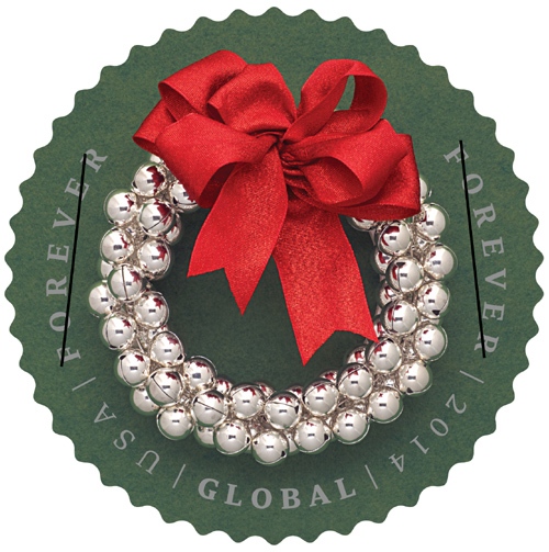 Global Forever Christmas Evergreen Wreath The 2014 Global Forever stamp for the holiday season pictures a wreath constructed by Michael Owen, titled the Silver Bells Wreath, the second in this Holiday Forever series. This international rate stamp offers a single price for any First-Class Mail International one-ounce letter to any country in the world or for a 2-ounce letter to Canada. To distinguish it from domestic rate Forever stamps, it is round and bears the words "Global Forever." |