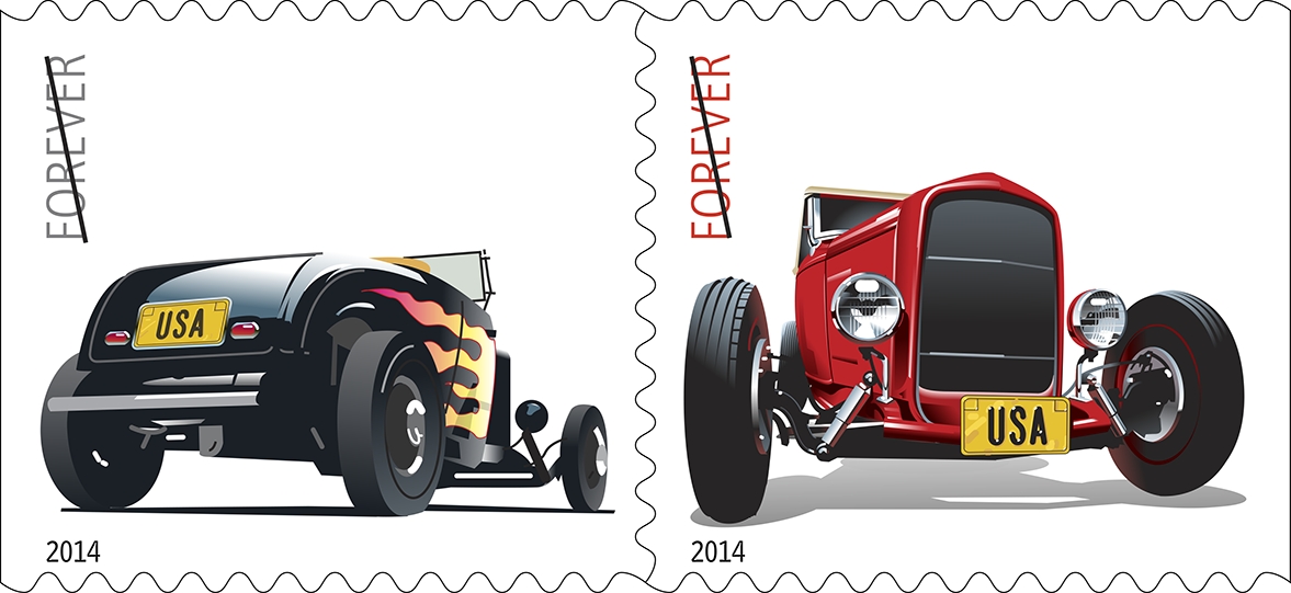 Hot Rods (Forever) Cars in general and Hot Rods in particular are a popular part of Americana. With these two stamps, the U.S. Postal Service celebrates these fast, powerful vehicles that thrill-seeking enthusiasts have been modifying for nearly a century. The cars depicted are two 1932 Ford Deuce roadsters. One stamp features a black 32 Ford with orange flames running down the car s body. The other stamp showcases a red 32 Ford. Art director Derry Noyes designed the stamps, which feature art by John Mattos. The stamps will be issued during a major Hot Rod weekend in York, Pa. |