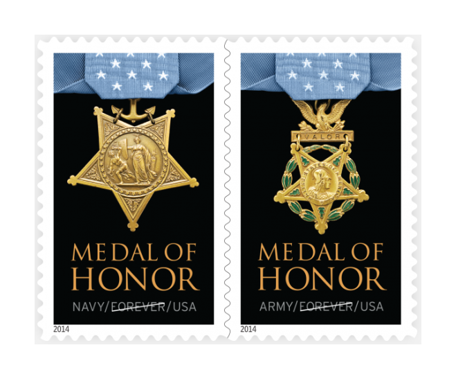 Purple Heart (Forever) The 2014 Purple Heart stamp uses a design by Jennifer Arnold of Washington, D.C. For the 2012 version, Arnold reworked the previous Purple Heart Forever stamp design by slightly enlarging the medal and placing it on a pure white background. The 2014 stamp used that same 2012 design except for the year date change from to 2014, and its placement horizontally in the lower left. The design features the Purple Heart awarded during World War II to 1st Lieutenant Arthur J. Rubin (1917–1978). The Purple Heart is awarded in the name of the President of the United States to members of the U.S. military who have been wounded or killed in action. It was established by General George Washington during the Revolutionary War and shows a profile bust of George Washington beneath his family coat of arms.