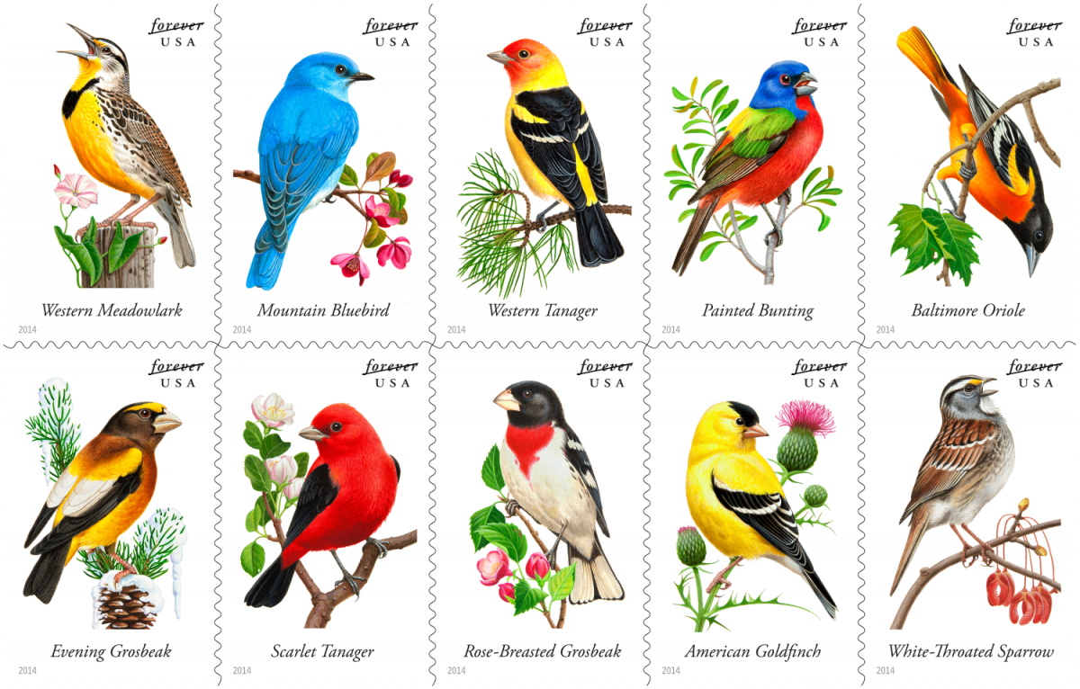 Song Birds (Forever) [Click for block of 10 Songbird designs] Between 4,000 and 4,500 different types of songbirds can be found around the world. Male birds sing to attract females and to warn rivals to keep out of their territory. They are identified by their highly developed vocal organs, although some, like the crow, have harsh voices, and others sing rarely, or not at all. All songbirds are classified as perching birds. With three toes that point forward and one that points backward, they can grip branches, grasses, or telephone wires with ease. The ten in this set are the western meadowlark, mountain bluebird, western tanager, painted bunting, Baltimore oriole, evening grosbeak, scarlet tanager, rose-breasted grosbeak, American goldfinch and the white-throated sparrow. |