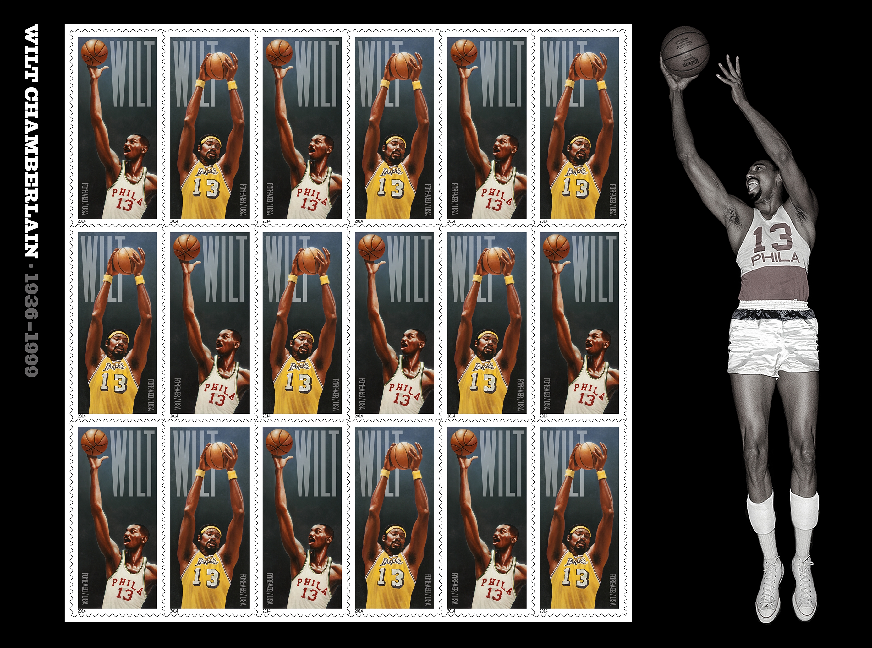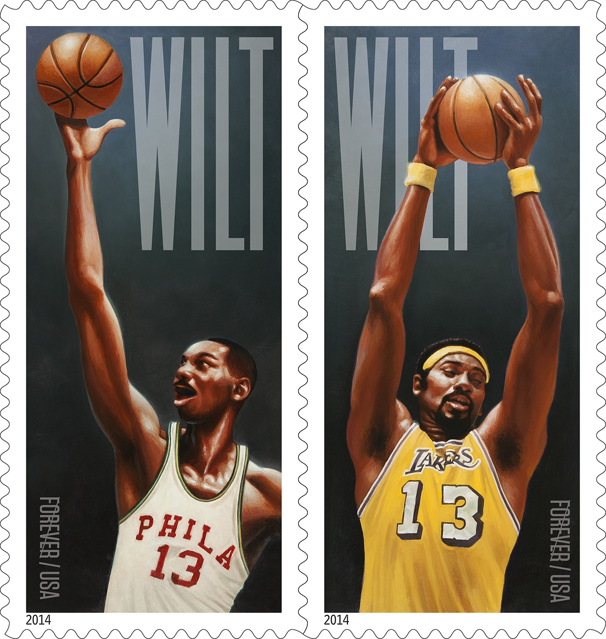 Wilt Chamberlain Basketball star Wilt Chamberlain appears on a pair of stamps, one as a Philadelphia 76er, and the other as a Los Angeles Laker, the two teams with which he won NBA Championships. The stamps are to be issued at halftime of a 76ers home game against the Oklahoma Thunder. (The 76ers do not play the Lakers until March 2015, in home-and-home games at L.A. and Philadelphia.) Chamberlain set a record by scoring 100 points in a single game in 1962, and played with several professional teams on his way into the Basketball Hall of Fame. He also was a college star with the University of Kansas. Because of his 7'-1" frame, the stamps have an appropriately tall format. Click here to see National Basketball Association (NBA) stamps from The Inter-Governmental Philatelic Corporation (IGPC). |
