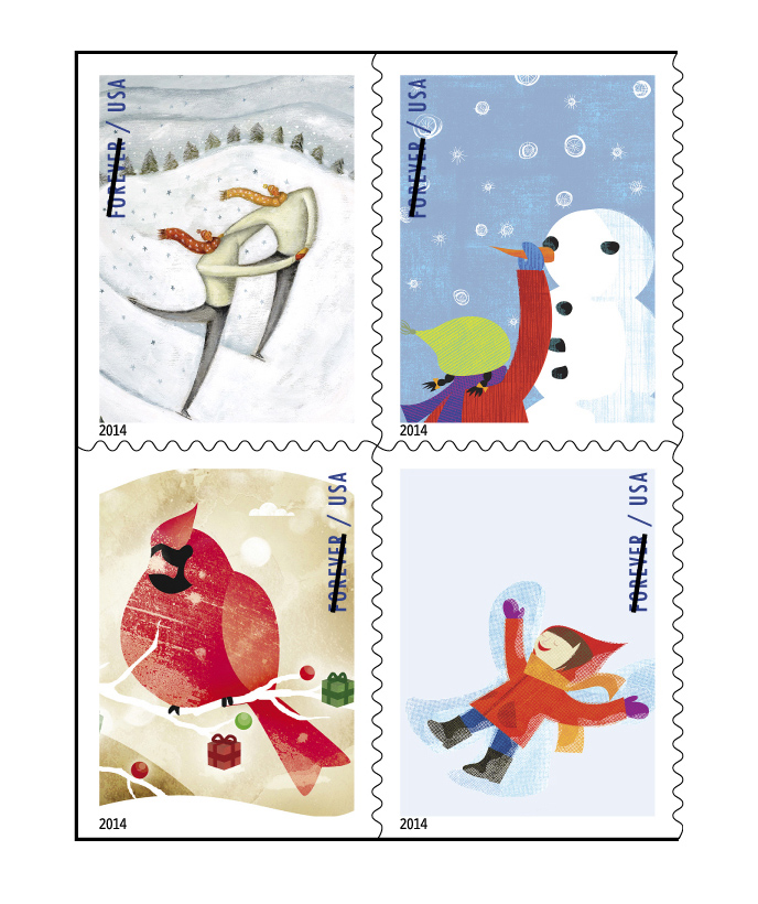 Winter Fun Contemporary Christmas The Winter Fun set of four designs will feature ice skating, making snow angels, building snowmen and bird watching (in this case, a cardinal). Art Director Ethel Kessler designed the stamps using illustrations by Janet Atkinson, Jing Jing Tsong and Christine Roy. Stamped envelopes using the snowman and cardinal designs, possibly similar in purpose to the oversized envelope Butterfly stamps (see February 10, above) may also be issued. |