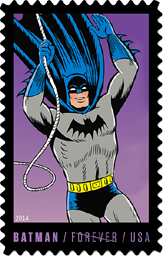 Batman 75 Years A surprise addition to the 2014 schedule, New York Comic Con 2014 is the issue site for the Batman stamps. The issue, which commemorates the 75 years of Batman, includes Batman depicted from the four eras of comic book history as well as the four incarnations of the Bat emblem (top to bottom rows on the sheet): the Modern Age (top row of the sheet), the Bronze Age, the Silver Age, and the Golden Age. The stamps are the USPS' 2015 National Stamp Collecting Month issue. Read "Batman Surprise October 9" [PDF Document] |