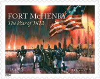 War of 1812 (Forever) The Postal Service continues its commemoration of the War of 1812 with a stamp that depicts the bombardment of Fort McHenry in Baltimore in September 1814. The stamp depicts the battle from the vantage point of a group of soldiers manning a cannon in defense of the fort. It gives prominence to 'the rockets' red glare" about which Francis Scott Key wrote in his "The Star-Spangled Banner,” a poem that was later set to music and became the U.S. national anthem in 1931. On March 3, 2014 the USPS issued a separate stamp for "The Star Spangled Banner." |