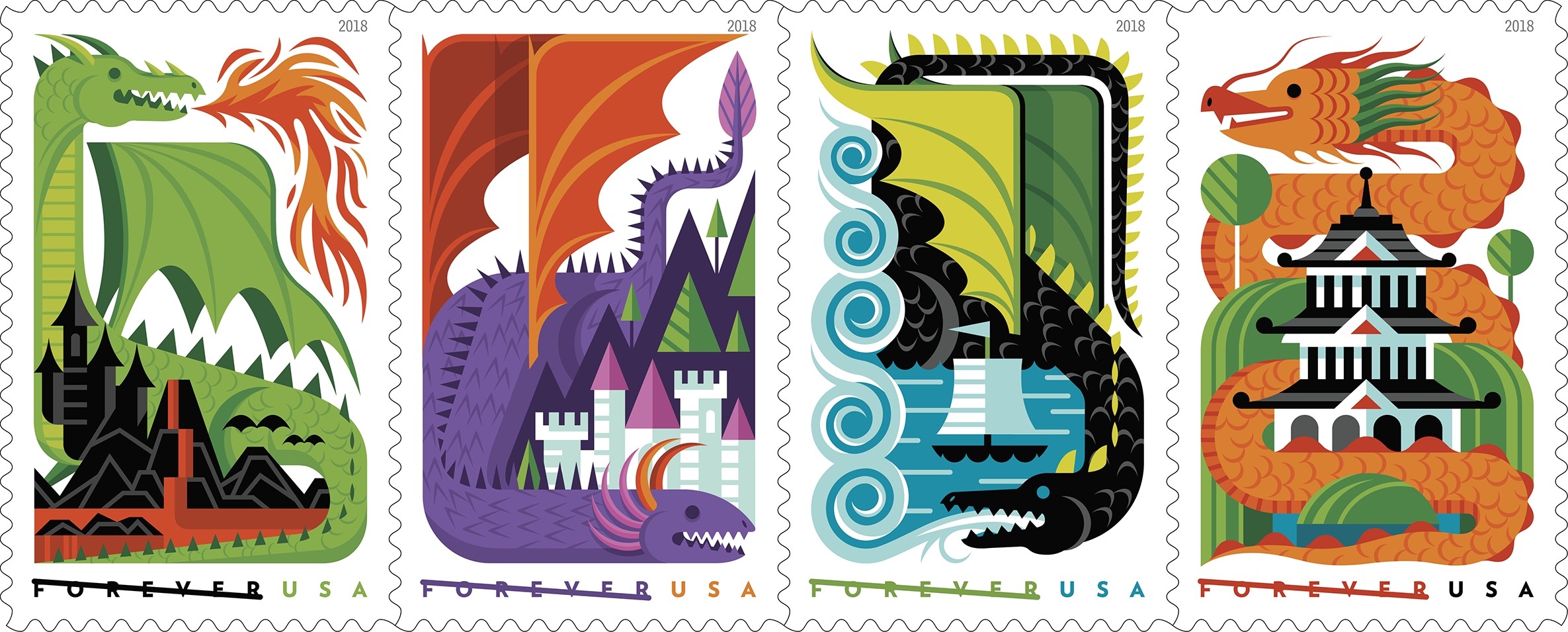 Dragons The Dragons stamps will be issued during the APS Stamp Show, to be held August 9-12 in Columbus, Ohio. The four designs present a green fire-breathing dragon towering over a medieval-inspired castle; a purple dragon with orange wings and sharp black armor on its back snaking around a white castle; a black dragon with green wings and green armor on its back swooping past a ship on the sea; and a wingless orange dragon weaving its way around a pagoda. The Postal People tell us, "Throughout history and across the globe—from Europe to the Middle East to Asia to the Americas—people have enjoyed tales of mythological creatures. Though these legendary animals vary in shape, size and color, they’re most often described as lizard-like with four legs, sharp claws, scales, wings and spiky tails. The wingless orange dragon weaving its way around a pagoda is inspired by creatures found in Asian art, architecture, folk religion and ancient lore. European folklore inspired the dragons on the purple dragon with orange wings and sharp black armor on its back, and the green fire-breathing dragon."