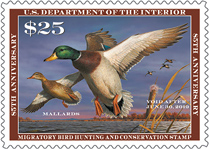 $25 Federal Duck Stamp & Junior Duck Stamp (not postage stamps) The 2018-2019 Duck stamp features Bob Hautman's acrylic painting of a pair of mallards in flight. This is Bob Hautman's third Federal Duck Stamp contest win. The new stamp is valid from July 1, 2018 through June 30, 2019. In addition to being required by waterfowl hunters age 16 and older, it also is popular with conservationists and collectors. Duck stamps are not postage stamps; they are conservation revenue stamps. The Fish and Wildlife Service (FWS) produces the Federal Duck Stamp, which raises about $25 million each year. FWS states that 98 percent of the purchase price goes directly to help acquire and protect wetland habitat and purchase conservation easements for the National Wildlife Refuge System. The $5 Junior Duck stamp was designed by Rayen Kang of Johns Creek, Ga. with an acrylic painting of an emperor goose. |