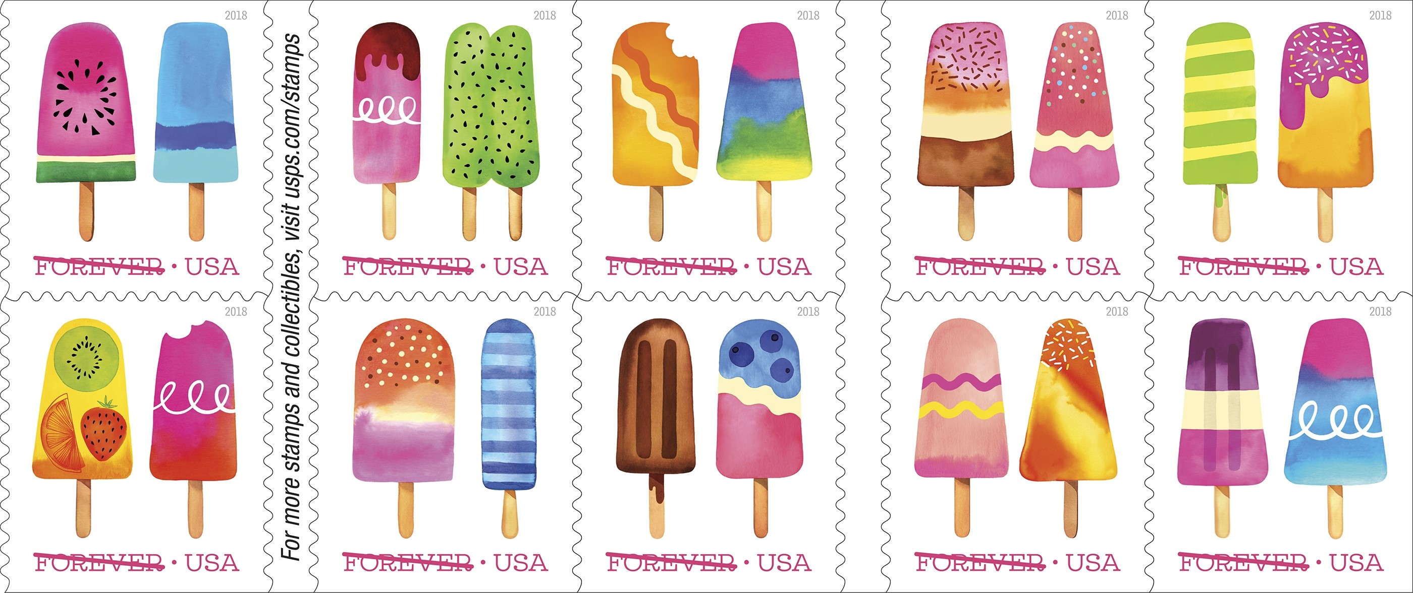Frozen Treats The Frozen Treats stamps showcase whimsical watercolor illustrations. The release date fits with the season, as Americans enjoy cool, refreshing ice pops on hot Summer days. Modern frozen treats are available in many varieties. Ice pops are made by large manufacturers, home cooks, and artisanal shops. In recent years, frozen treats containing fresh fruit such as kiwi, watermelon, blueberries, oranges, and strawberries have become more common. In addition, flavors such as chocolate, root beer, and cola are also popular. The Postal People also have announced that the Frozen Treats will be the first Scratch & Sniff U.S. stamps, and “will add the sweet scent of summer to letters of love, friendship, party invitations and other mailings.” (They did not mention, but we will, that like most ice pops, they also will be sticky—on the gum side, of course.) |