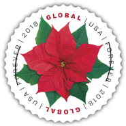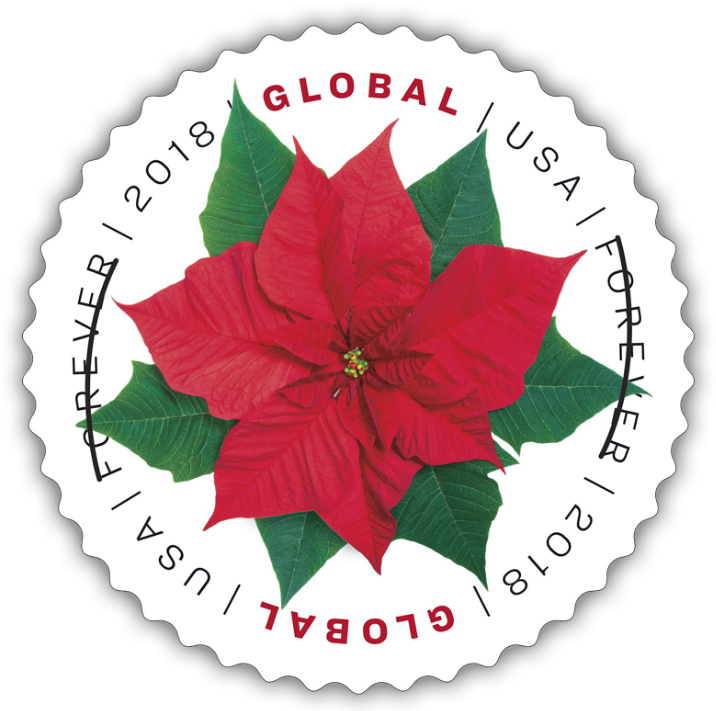 Global Poinsettia For the first time since 2014, the USPS is releasing a new Global Forever Holiday Stamp. Picturing a bright red Poinsettia, this stamp can be used to mail a 1-ounce letter to any country where First-Class Mail International service is available. As with all Global Forever stamps, this stamp will have a postage value equivalent to the price of the single-piece First-Class Mail International 1-ounce machineable letter in effect at the time of use. These stamps can also be used domestically. At present, they would pay $1.15 in postage. Tens of millions of poinsettia are sold during the Holiday season. The stamp art features an overhead view of a poinsettia to capture the beauty of the green leaves, the red bracts and the yellow flowers in the center of the plant. The new Global Forever stamps are being issued in self-adhesive panes of 10. |