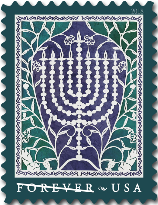 Hanukkah The Jewish holiday of Hanukkah will be celebrated with a new stamp issued jointly with Israel Post. Hanukkah celebrates the rededication of the Temple in Jerusalem in the second century B.C. after it was reclaimed from armies that desecrated the sanctuary. The stamp features a Hanukkah menorah created using Jewish folk art papercutting techniques. Tradition relates that during the Temple rededication—Hanukkah is the Hebrew word for “dedication”—the oil needed to light the lamps, although only enough to burn for one day, miraculously burned for eight days until new oil could be pressed. Celebrations include the ritual lighting of the hanukiah, the nine-branched menorah used only during Hanukkah. Eight branches hold candles representing each of the eight nights and days of Hanukkah; the ninth, the shamash or “servant,” is used to light the other candles. Behind the menorah is a shape reminiscent of an ancient oil jug. Additional design elements include dreidels—spinning tops—and a pomegranate plant with fruit and flowers. In 2018, Hanukkah runs from sundown December 2 to sundown December 10. |