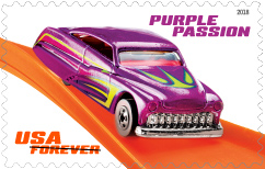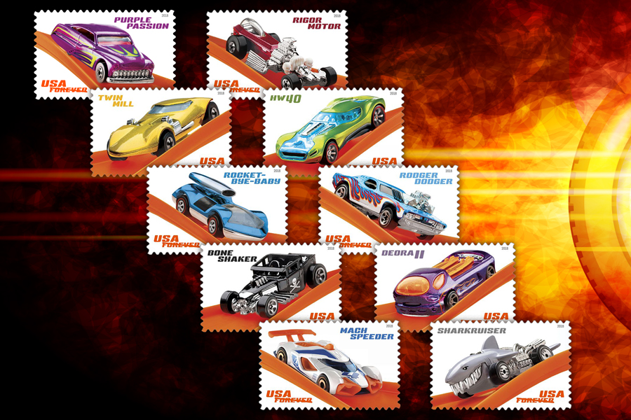 Hot Wheels Since the inception of Hot Wheels, Mattel has produced thousands of varieties of cars. The issue celebrating Hot Wheels’ 50th anniversary, will feature 10 of the most outrageous to their car designs. Arranged in diagonal rows, the pane shows the Hot Wheels cars speeding al ong a bright orange track. Each stamp has the name of these vehicles in one of the top corners: Top row (left to right): |