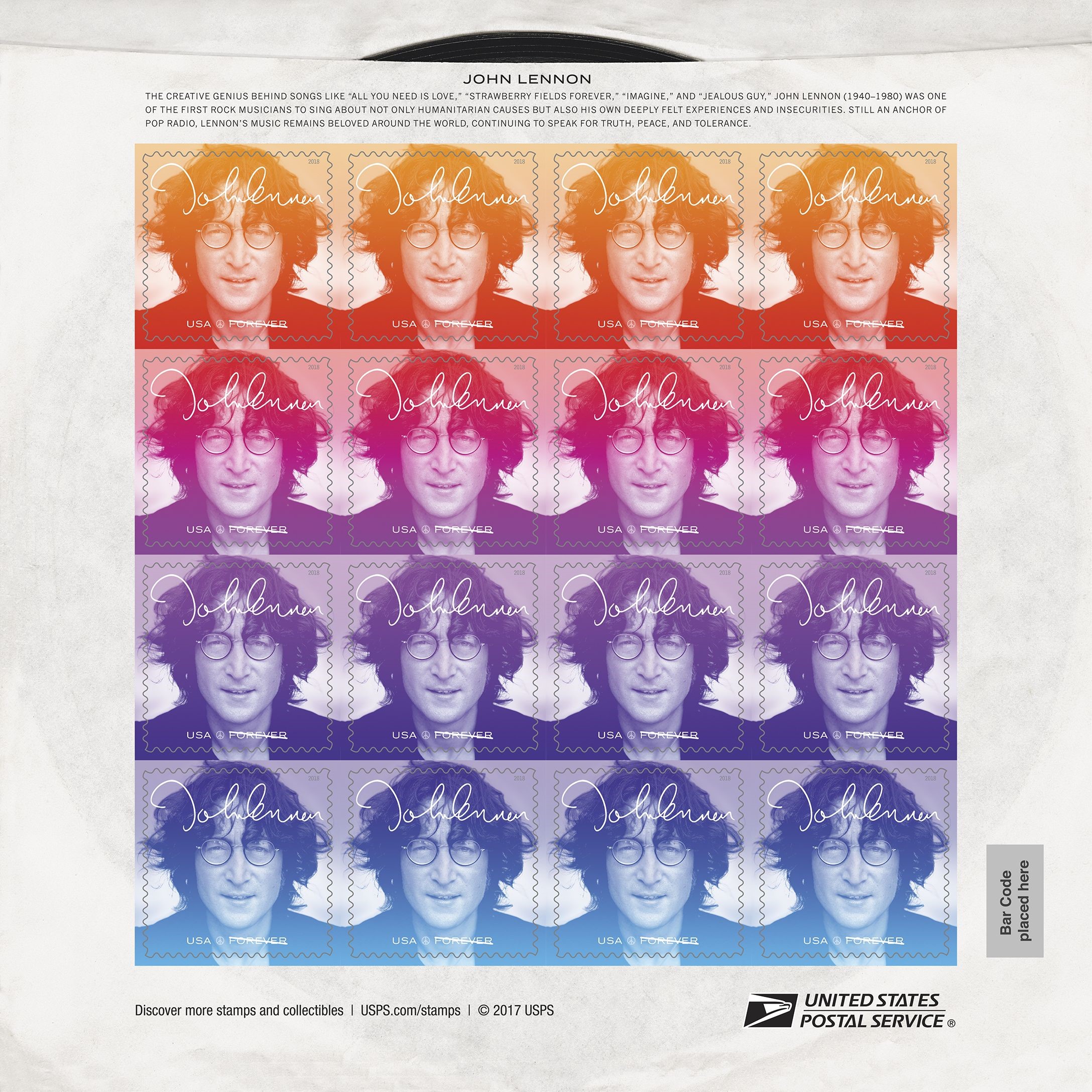 John Lennon (Music Icons series) This stamp honors singer and songwriter John Lennon (1940–1980), a rock ’n’ roll hero successful both as a founding member of the Beatles and as a solo artist. Although issued as part of the Postal Service’s Music Icons series, his influence goes well beyond his music and continues decades after his death. The September 7 date fits with the design of the stamp and “Imagine,” the song he wrote and the album by that name, which was issued on September 9, 1971. The stamp features a photograph of John Lennon taken by rock-and-roll photographer Bob Gruen in August 1974. The original black-and-white photograph has been treated in gradations of color. The stamp pane is designed to resemble a vintage 45 rpm record sleeve. One side of the pane includes the stamps and brief text about Lennon’s legacy. A black-and-white photo of Lennon seated at his white piano appears on the reverse. Taken by photographer Peter Fordham, the original photograph was used to promote Lennon’s 1971 solo album, “Imagine.” |