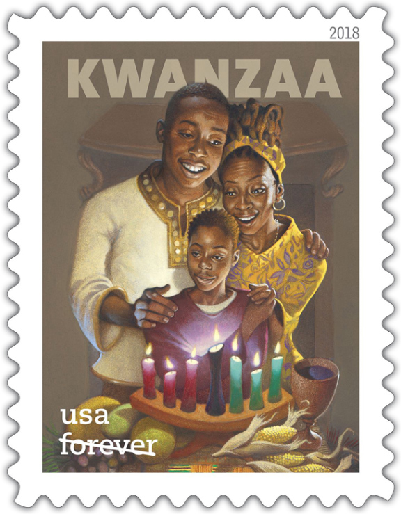 Kwanzaa With this new stamp, the Postal Service celebrates Kwanzaa with the seventh stamp since 1997 designed for the annual Pan-African holiday that takes place over seven days from December 26 to January 1, and brings family, community and culture together for many African-Americans. The most recent previous Kwanzaa stamp was issued in 2016. As opposed to previous indistinguishable images, this new stamp depicts a family adorned in a mixture of western and traditional clothing, paying tribute to the holiday’s focus on the contemporary African-American experience while also drawing on African roots.The family is gathered around a kinara (candleholder), the warm light from seven candles illuminating their faces. Several other important Kwanzaa symbols sit on the table—a few ears of corn, various fruits and vegetables, the unity cup and a straw mat on which everything is placed. Created in 1966, Kwanzaa draws on African traditions, deriving its name from the Swahili phrase “matunda ya kwanza,” meaning “first fruits.” |