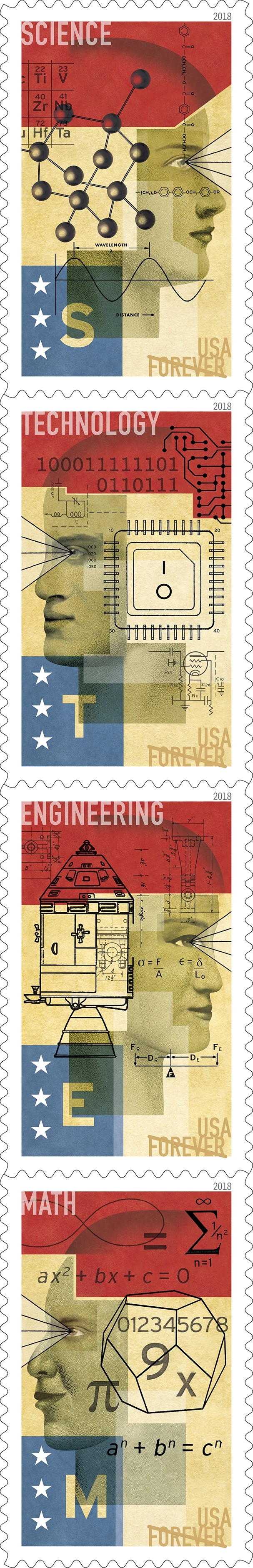 STEM Education These stamps celebrate the role of science, technology, engineering, and mathematics (STEM) education in keeping the United States a global leader in innovation and providing new opportunities for all Americans to learn and explore the world. Each of the four stamps features a collage of faces, symbols, drawings, and numbers that represent the complexity and interconnectedness of the STEM disciplines. In 2015 the Department of Education established the Committee on STEM Education and explained, “The United States has developed as a global leader, in large part, through the genius and hard work of its scientists, engineers, and innovators. In a world that’s becoming increasingly complex…it’s more important than ever for our youth to be equipped with the knowledge and skills to solve tough problems, gather and evaluate evidence, and make sense of information…subjects collectively known as STEM.” |