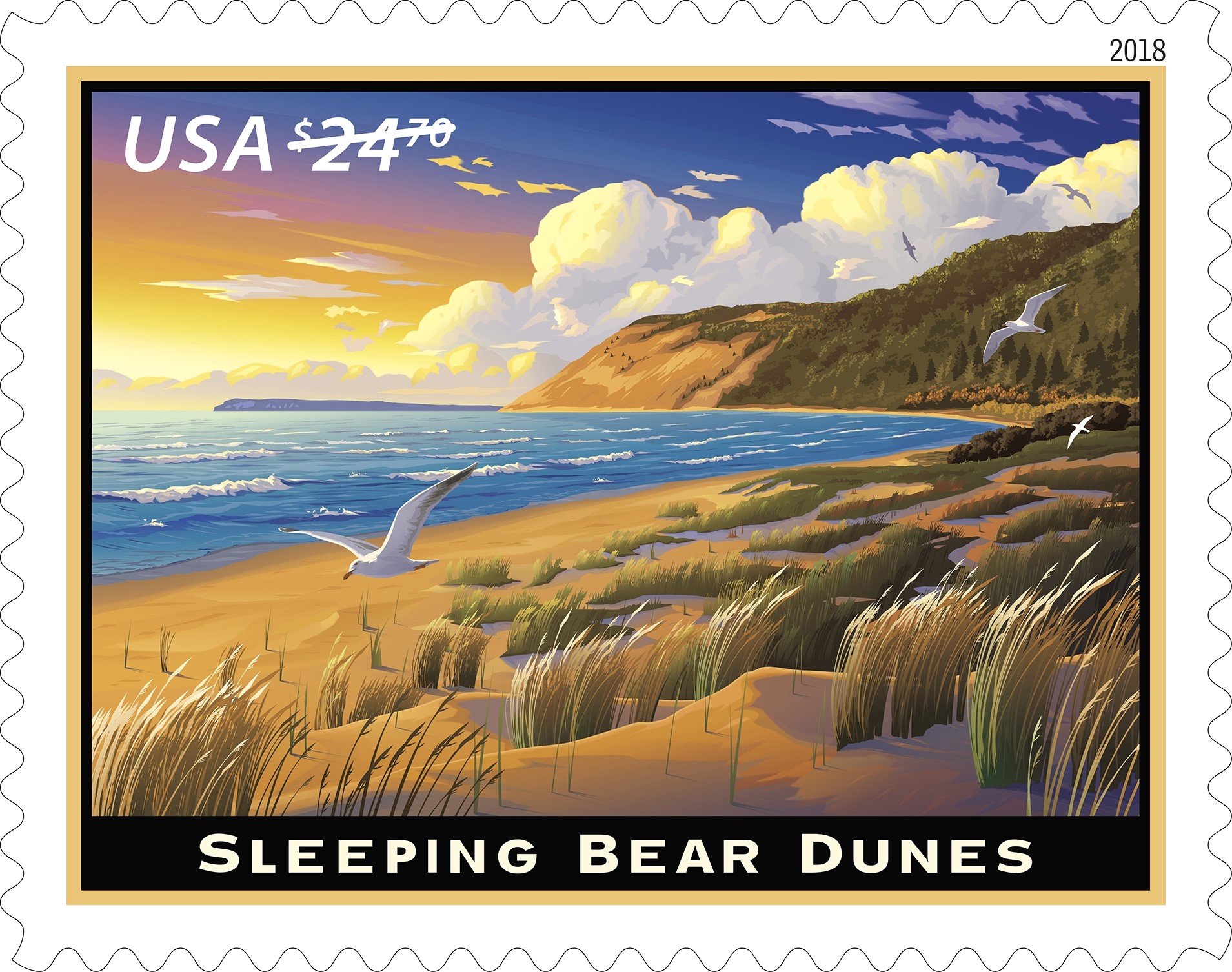 Sleeping Bear Dunes (Priority Mail Express) — January 21 | Kansas City, MO | PSA pane of 4 stamps Click to see larger image. With this Priority Mail Express stamp, the Postal Service celebrates the Sleeping Bear Dunes, a national park in Michigan that takes its name from a Native American legend. |