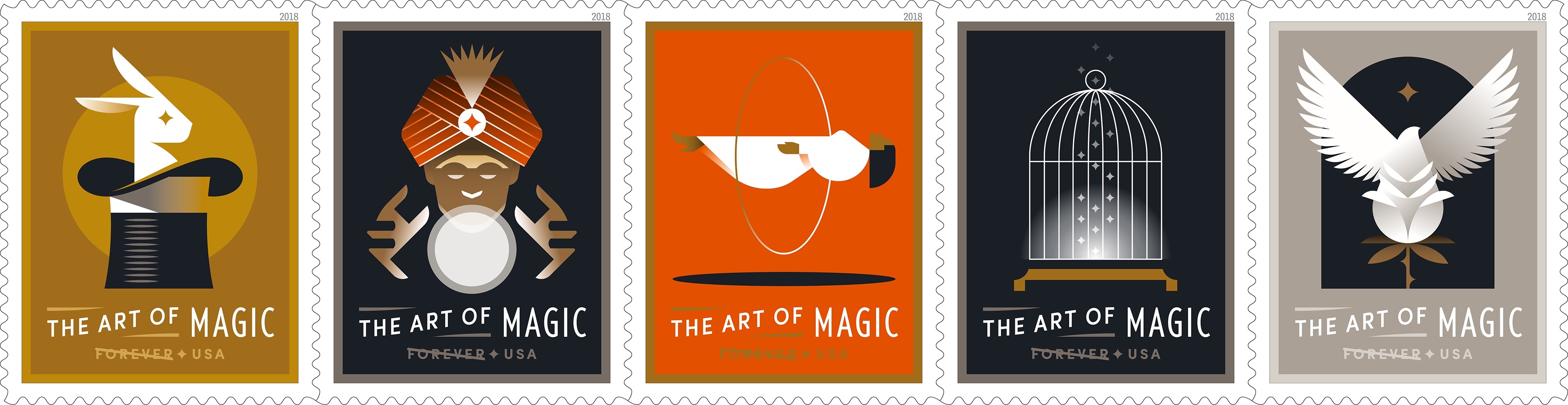 The Art of Magic The Postal Service celebrates the art of magic with this pane of 20 stamps featuring digital illustrations of five classic tricks magicians use to amaze and delight audiences: a rabbit in a hat (production), a fortune teller using a crystal ball (prediction), a woman floating in the air (levitation), an empty bird cage (vanishing), and a bird emerging from a flower (transformation).