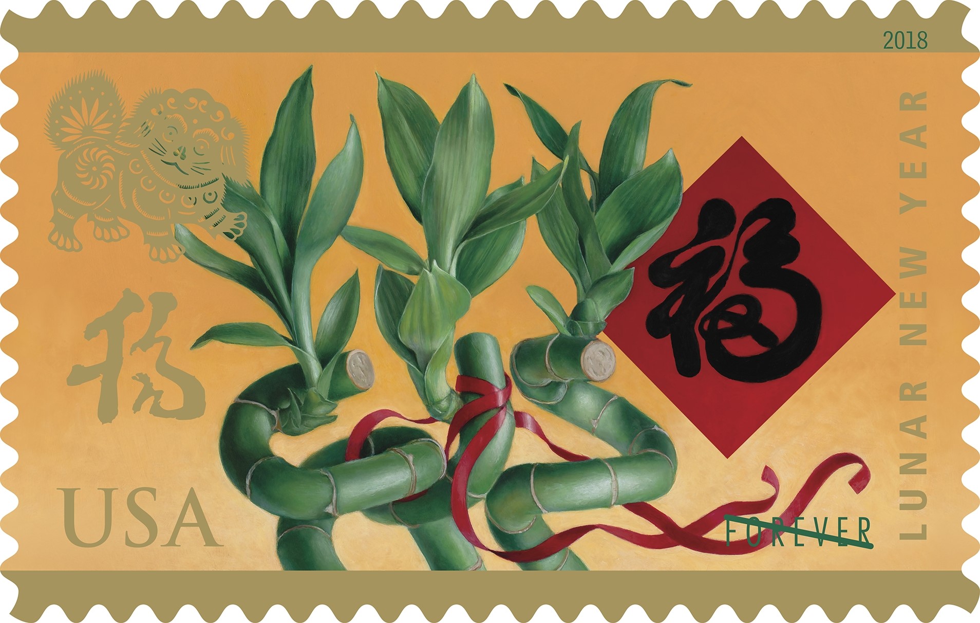 Year of the Dog Forever Stamp (Celebrating New Year series) The Lunar New Year begins February 16, 2018 and ends February 4, 2019. In the Lunar New Year cycle, the Dog symbolizes caring, loyalty and honesty. The Year of the Dog stamp is the 11th of 12 stamps in the current Celebrating Lunar New Year cycle. The artwork focuses on some of the common ways the Lunar New Year holiday is celebrated. It depicts an arrangement of lucky bamboo. On the red paper to the right, the Chinese character fu—meaning good fortune, rendered in calligraphy—is a common decoration on doors and entryways during Lunar New Year festivities. |