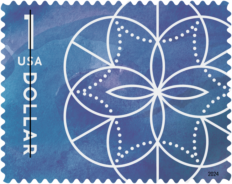 In 2024, a new Floral Geometry stamp, denominated at $1, will be available for purchase. The stamp will complement the similarly designed $2 and $5 stamps issued in 2022 and the $10 stamp issued in 2023. The stamps lend an elegant and contemporary appearance to packages, large envelopes and other mailings. The stamp art features a series of overlapping geometric shapes that mimic the symmetry of floral patterns found in nature. The watercolor background and the glimmer of the foil-stamped design and typography create a sophisticated look. This stamp will be issued in panes of 10. The stamps were designed and created by the firm Spaeth Hill. Antonio Alcalá served as art director for USPS. |