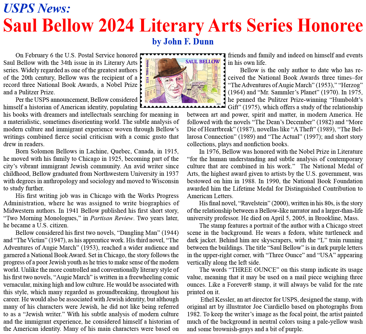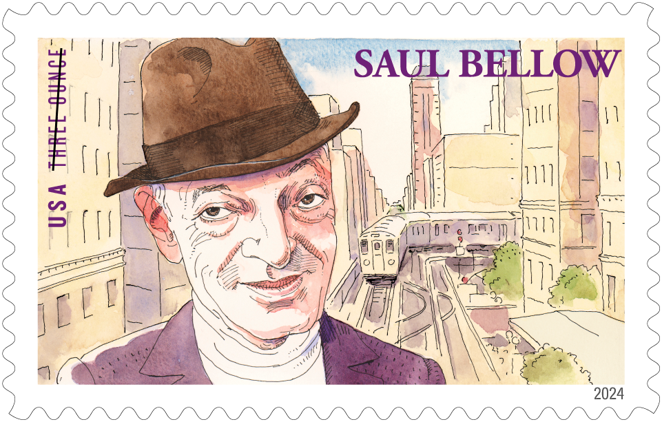Saul Bellow Three Ounce Rate Stamp The 34th issuance in the Literary Arts series honors novelist Saul Bellow (1915-2005). Winner of three National Book Awards, a Pulitzer Prize and the Nobel Prize, Bellow is widely regarded as one of the greatest authors of the 20th century. The stamp art is a portrait of Bellow in pen, ink and watercolor based on photographs from 1982. In the background is a street scene of Chicago, where he lived most of his life. Ethel Kessler, an art director for USPS, designed the 3-ounce stamp with original art by Joe Ciardiello. |