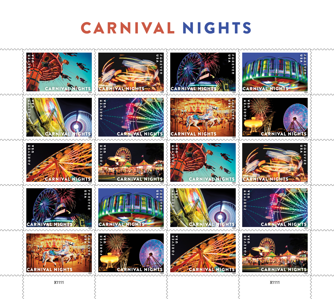 Carnival Nights celebrates one of America's favorite pastimes. The stomach-twisting thrill rides, the indulgent snacks and sweets and the general spirit of lighthearted fun make the nation's carnivals and fairs a place for visitors of any age to enjoy. Ten new stamps in a pane of 20 feature photographs that convey the energy and color of a summer carnival at night. Greg Breeding, an art director for USPS, designed the stamps with existing photographs. |