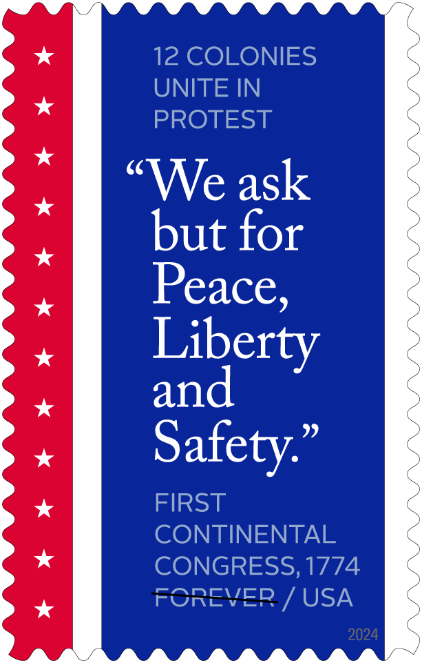 In 2024, the Postal Service commemorates the 250th anniversary of the First Continental Congress. Made up of delegates from 12 of the 13 Colonies, the First Continental Congress convened in 1774 to decide how the Colonies should respond to increasing threats to their freedom. In addition to denouncing taxation without representation, the Congress called for a general boycott of British goods. It also issued a declaration of rights that included life, liberty, property and trial by jury, and laid the foundation for government during the American Revolution. The stamp art features a quote from the Congress’s protest letter to the King of England. The 12 stars stand for the 12 Colonies represented at the meeting. (Georgia did not agree with the protest and did not send representatives.) Antonio Alcalá served as art director, designer and typographer for this stamp. |