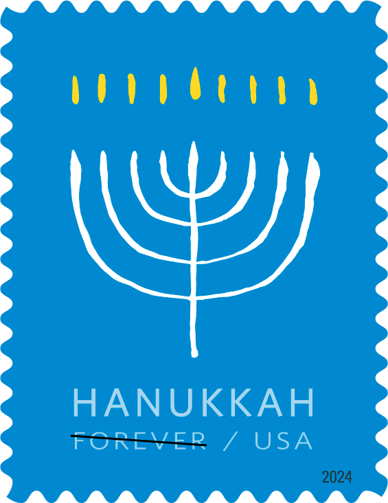 Hanukkah Forever Stamp A new stamp celebrating the joyous Jewish holiday of Hanukkah will be issued in 2024. The art is a graphic depiction of a hanukiah, the nine-branch candelabra used only at Hanukkah, with all candles lighted, signifying the last evening of the holiday. The artwork is created mostly in blue and white, common Hanukkah colors. Antonio Alcalá, an art director for USPS, designed and illustrated the stamp art. |
