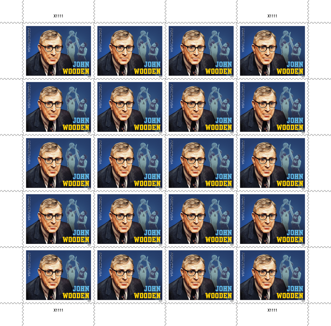 Legendary coach John Wooden (1910-2010) led the University of California, Los Angeles (UCLA) Bruins to a record-setting 10 Division I men's basketball national championships. Often considered the greatest coach in the history of American sports, Wooden coached the Bruins to 88 consecutive wins and four perfect (30-0) seasons. The stamp features a portrait of Wooden. In the "UCLA blue" background, a player defends a shot. The numbers on the two players' jerseys, 4 and 10, evoke the Bruins' four perfect seasons and the 10 national championships during Wooden's tenure. Antonio Alcalá, an art director for USPS, designed the stamp using original artwork by Alexis Franklin. |