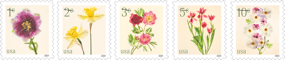 A new series of low denomination stamps will debut in 2024. Each stamp will showcase a different flower design: 1-cent fringed tulip, 2-cent daffodils, 3-cent peonies, 5-cent red tulips and 10-cent poppies and coneflowers. Photographer Harold Davis combines innovative technology with digital painting and photographic techniques to arrive at his unique floral designs. These stamps will be available in panes of 20 and coils of 10,000. Ethel Kessler, an art director for USPS, designed the stamps. |
