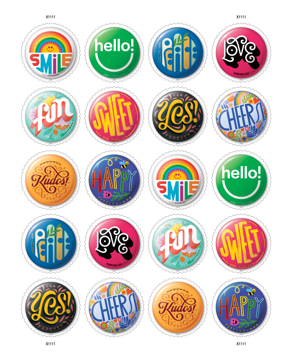 Pinback Buttons Forever Stamp These vibrant stamps will add cheer and whimsical flair to cards and envelopes. The pane of 20 stamps features 10 typographic designs by 10 different artists in their unique styles, each with a single word as the prominent element — smile (Don Clark), hello! (Tré Seals), peace (Jay Fletcher), love (Juan Carlos Pagan), fun (Gia Graham), sweet (Jeff Rogers), yes! (Ryan Feerer), cheers! (Lisa Congdon), kudos! (DKNG Studios) and happy (Gina Triplett). The round shape of the stamps, as well as shadowing and reflection effects, give the appearance of three-dimensional pinback buttons. The pane verso features an illustration of a round silver button back with pin fastener repeated 20 times, one for each pinback button stamp shown on the front of the pane. Greg Breeding, an art director for USPS, designed the stamps. |