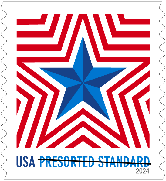 Radiant Star will be a new presorted standard stamp intended for bulk mailers and will be sold in self-adhesive coils of 3,000 and 10,000. In this vibrant graphic design, red and white stripes radiate from a blue star. The star is in two shades of blue to give it a three-dimensional look. Antonio Alcalá was the art director for USPS on the project. The stamp was designed by Carol Beehler. |