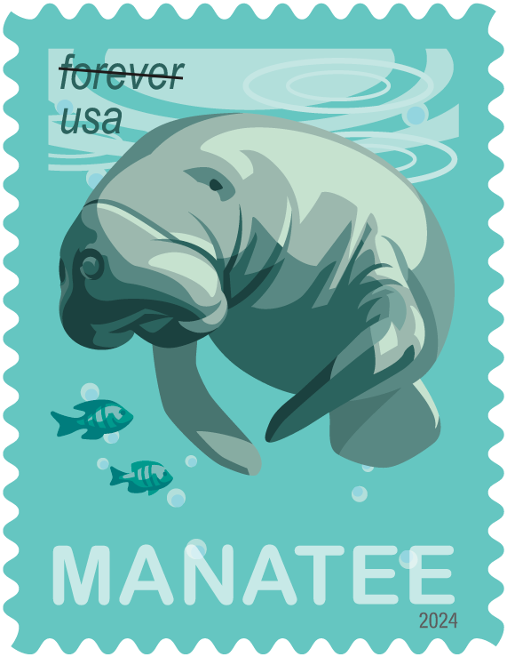The Save Manatees stamp will be issued to create awareness about the threats posed to this beloved marine mammal. Human vigilance is crucial for its protection — both to minimize motorboat strikes and to maintain the aquatic plants on which the manatee feeds in the warm coastal waters in and around Florida. The stamp art is a digital rendering of a manatee placidly lolling near the surface of the water. Derry Noyes, an art director for USPS, designed the stamp and booklet cover using illustrator Nancy Stahl’s original graphic design. |