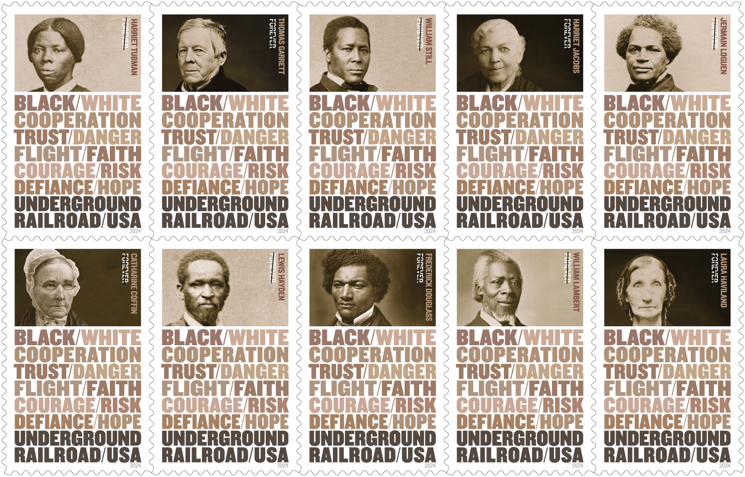 Underground Railroad Forever Stamps (Laura Haviland shown left) From the time slavery was introduced to the Colonies until it was abolished in 1865, enslaved people tried to escape. This stamp issuance commemorates the Underground Railroad, as their resistance efforts became known. The pane of 20 stamps features 10 sepia-toned portraits of men and women who escaped slavery and/or helped others escape: Catharine Coffin, Frederick Douglass, Thomas Garrett, Laura Haviland, Lewis Hayden, Harriet Jacobs, William Lambert, Jermain Loguen, William Still and Harriet Tubman. Below each portrait are eight lines of text: BLACK/WHITE; COOPERATION; TRUST/DANGER; FLIGHT/FAITH; COURAGE/RISK; DEFIANCE/HOPE; UNDERGROUND; RAILROAD/USA. On the pane’s verso is a map showing the general routes freedom seekers followed and a list of individuals pictured on the stamps with a few words of biographical information about each. Antonio Alcalá, an art director for USPS, designed the stamps using existing images. |