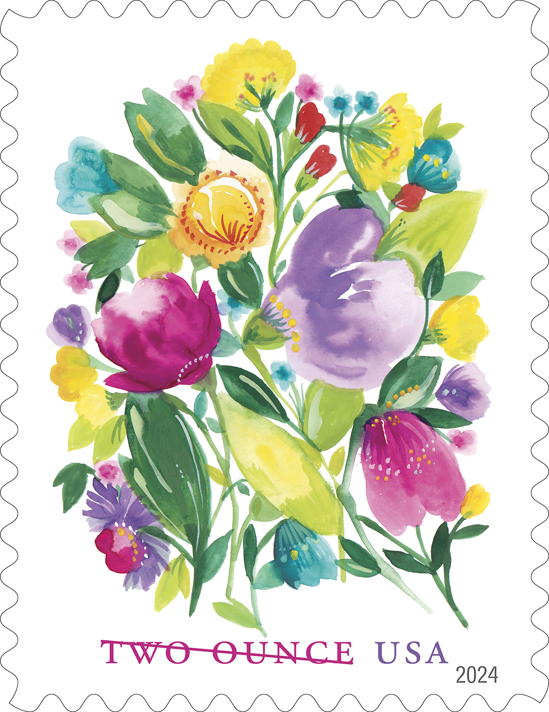 Wedding Blooms 2 Ounce Stamp This 2-ounce floral stamp can be used to accommodate the weight of heavy invitations for birthdays, weddings, anniversaries and other celebrations; oversized greeting cards; and small gifts that require extra postage. This stamp is similar in design to the Celebration Blooms Forever stamp, also to be issued in 2024. The two will form a natural pair. This stamp features a vertical graphic illustration of brilliantly colored flowers rendered in ink and gouache paint. Derry Noyes, an art director for USPS, designed the stamp using an existing illustration by artist Kim Parker. |